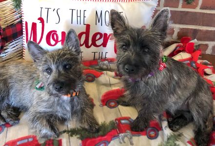 "Nora at 5 months. She is a delight! We have so much fun with her. She is best buddies with our son's dog. She is so smart and inquisitive. All Cairn! Thank you for such a great pup!"